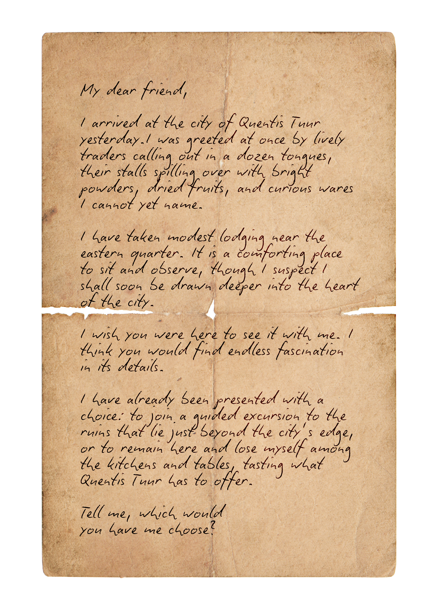 As your Asmarian penpal travels the world, you’ll help to guide their journey - for good and bad. If you push them to explore ancient ruins - there’s always a chance they might get injured. Or perhaps you urge them to try Tuukan’s underground cuisine and they pick up a parasite. Every action your penpal takes